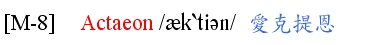 [解说] 1. “He was an ill-starred great hunter”:「他是个星运不佳的(倒霉的)大猎人。」 “ill-starred” = unlucky (运气不好的)。 2. “While hunting”= “While he was hunting”(当他在打猎时)。英文 “while…”子句中之主词与be动词常可省略。他例:“He typed while (he was) listening to music”(他边打字边听音乐)。 3. “he had the misfortune to come upon Artemis”:「他不幸遇见Artemis」。 “have the misfortune to …”是「不幸」之惯用语。他例: “She had the misfortune to lose the ring” = “Unfortunately she lost the ring”(她不幸丢了戒指)。比较: “I have the pleasure to see him in person”(我高兴亲自看见他)。 “come upon” = “meet unexpectedly” (不期而遇)。 4. “Artemis, the goddess of chastity”:「Artemis,贞洁的女神」。英文常用逗点(comma) 来引接同位语,他例: “She fell in love with Henry, the banker”(她爱上Henry这位银行家)。“chastity” (贞洁) 之形容词为 “chaste”。 5. “as she was bathing in the forest”:「当她在林中沐浴时」。英文 “as…”之子句,有「当…时」或「因为 …」之意。 “bathing”来自 “bathe” ,其名词为 “bath”。 6. “she changed him into a stag”(她把他变成鹿)。注意: “stag”是「雄鹿」,= “hart”; “doe”或 “hind”则为「母鹿」。“stag”也常指「纯男人聚会的」活动,如“stag night”(「男人夜」的活动)。 7. “and he was hunted and torn to pieces by his own hounds”:「然后他被自己猎狗追捕而撕成碎片」。 “torn to pieces” (撕成碎片) =“torn into pieces”。同样的, “change water into ice”也可说成 “change water to ice”。 “hounds” = hunting dogs (猎狗)。 8. 这段话说到 Actaeon 的不幸。倒霉的他看到贞洁的女神在洗澡,竟被化成鹿而活活被猎死。Artemis 本身是女猎人 (huntress),她的贞洁也未免太残忍了。